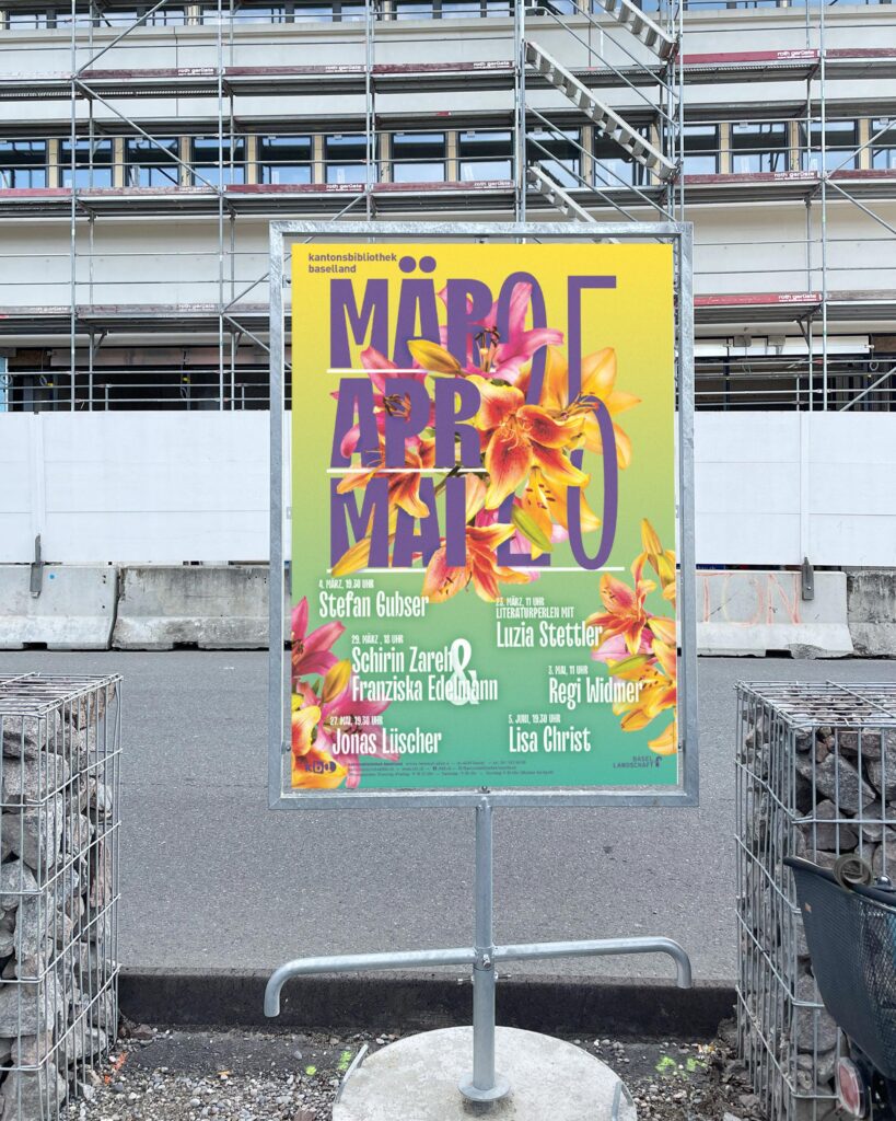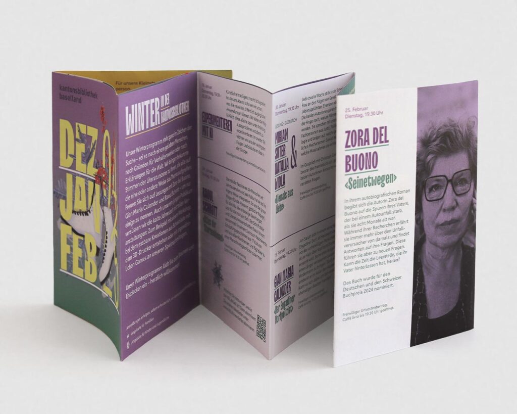 Grafik Programmheft und Plakat für die Kantonsbibliothek Baselland: Als Kontrast zur vorherigen Saison, ist die grafische Gestaltung dieser Saison gekennzeichnet durch starken Farbverläufen und eine collageartigen Kombination aus Bildmotiv und Typografie.